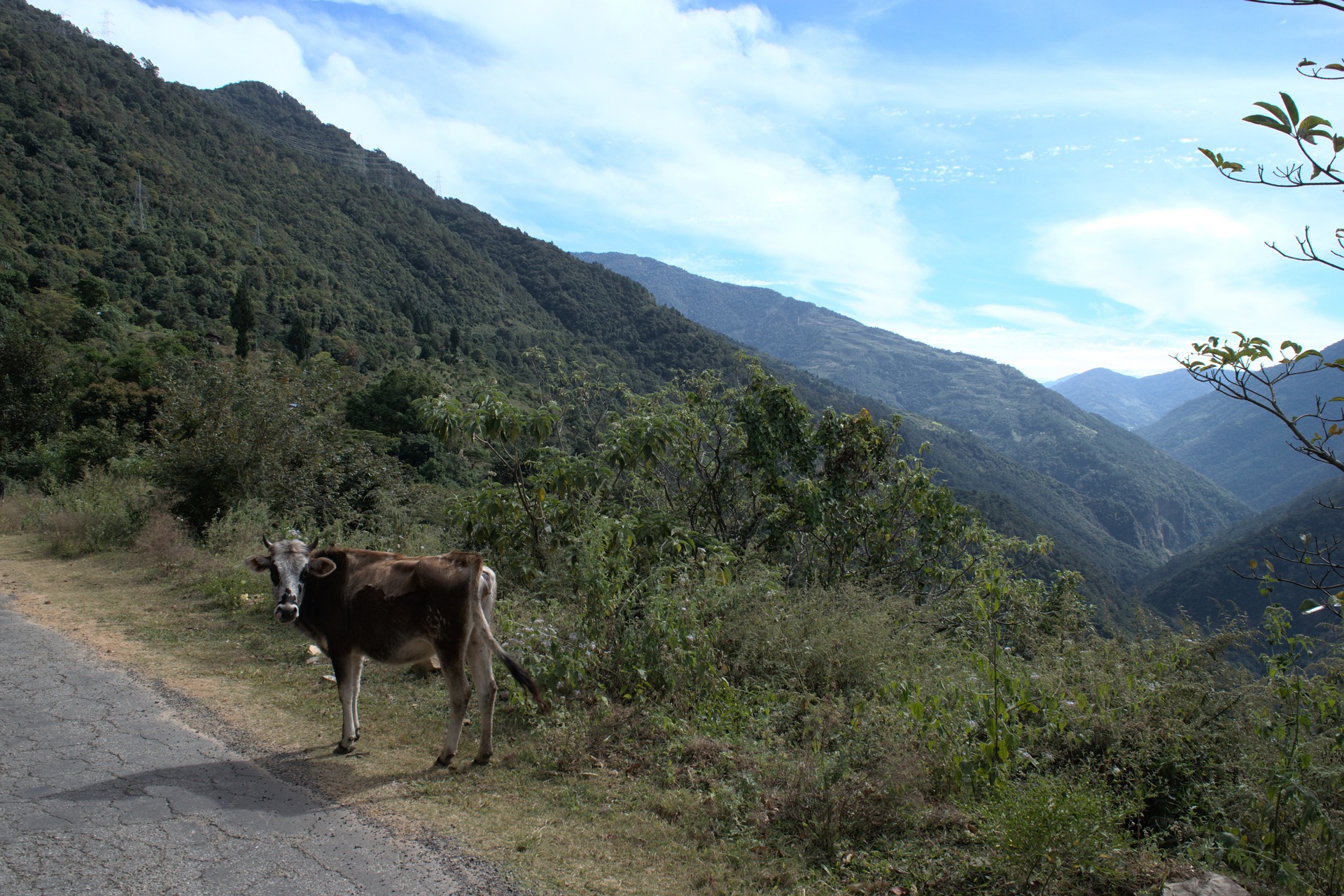 25. This photo was captured during a Himalayan Biogeography and Hydroelectricity fieldtrip to Bhutan in 2017 in a moment of reciprocal witnessing between myself and this cow. One of many who wander the steep roadsides as the Buddhist Bhutanese government does not allow killing of animals. It offered a moment to reflect on the notion of belonging. Passing through these places marketed as 'pristine' to high-paying Western tourists - I noticed these stray cows, unfamiliar and familiar 'weeds' (especially the florets of blue billygoat weed from my home in Brisbane) and strings of powerlines (dipping through the treetops of these globally renowned landscapes to provide electricity access to all rural residents), as active agents co-creating the cultural/natural environments of Bhutan.