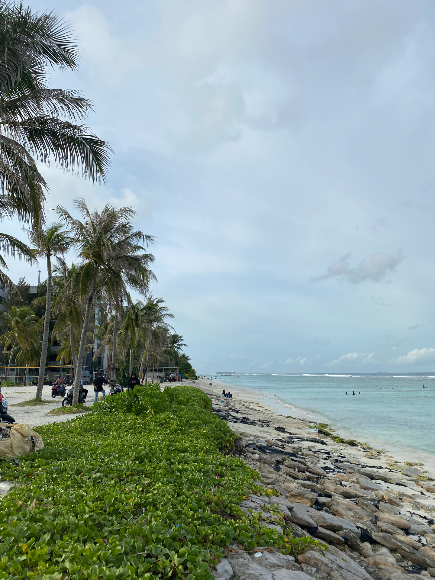 36. Hard and soft engineering solutions are often combined to protect small islands from rising seas. Hulhumale' shoreline is fortified with concrete filled geo-bags on an inclined sloped running parallel to creeping vines of beach morning glory (Ipomea Violacea) and coconut palms for a mix of engineering and nature based solutions.