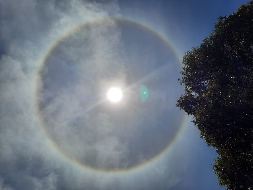 39. Sun halos are caused by ice crystals high in the sky in cirrus clouds scattering light. These ice crystals refract light at 22 degrees on average. Therefore more light gets refracted outwards than inwards making the inside appear darker and hence the halo appearance.