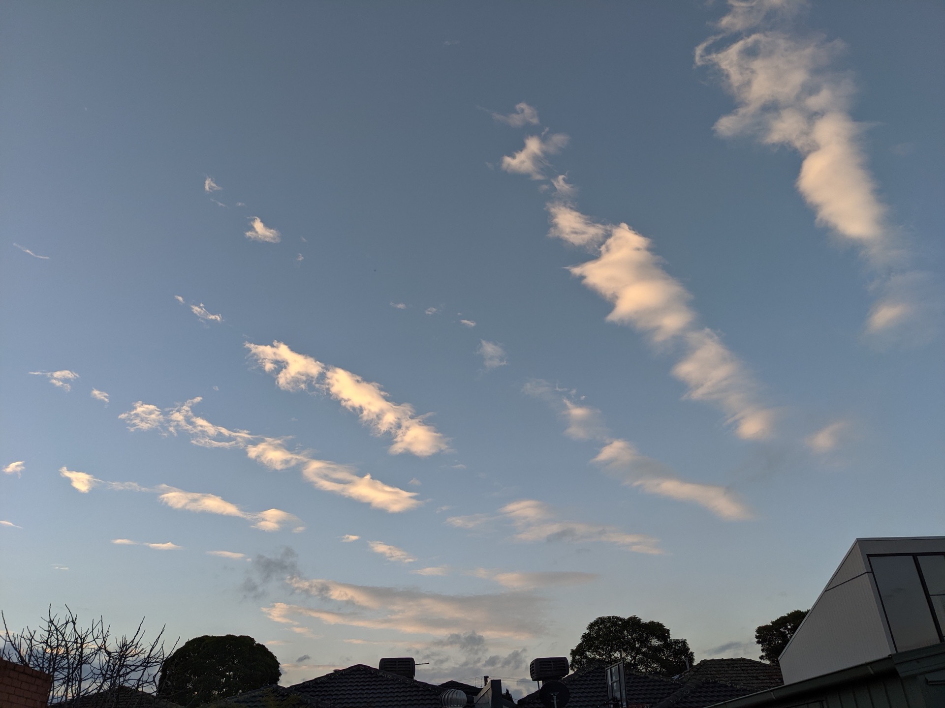 40. Ethereal altocumulus undulatus clouds as sunset, giving away the presence of a gravity wave. August 2020.